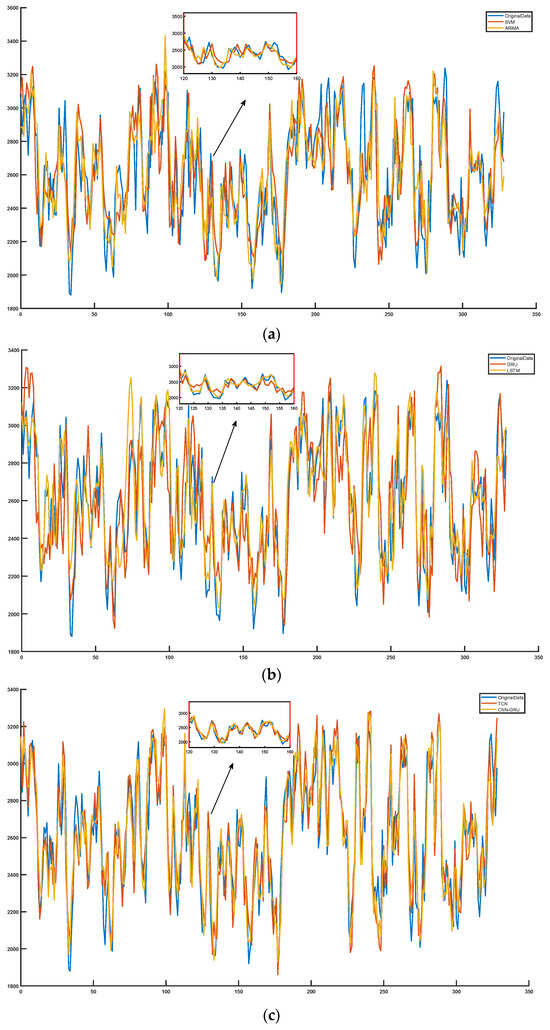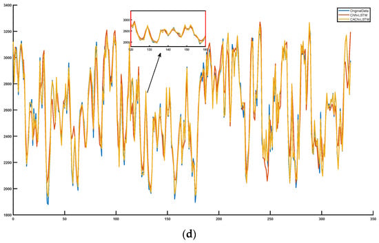 Figure 10d, the predictions of the CACN-LSTM model closely align with the original data, accurately predicting not only the overall trend and local trends of power consumption but also effectively predicting significant peaks and troughs. This indicates that the proposed CACN-LSTM model is capable of reliably and accurately predicting the local variations and overall trends in power consumption during the SAG mill grinding process.