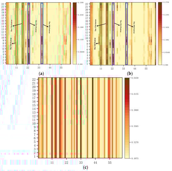 Figure 11a,b, the colors of the 23rd and 36th high-dimensional features in the heatmap are fading, indicating that the attention is less focused on these features. In contrast, the attention is more focused on the 11th and 17th high-dimensional features.