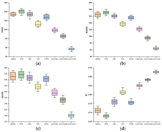 Figure 12, the fluctuation range of each indicator of CACN-LSTM is also the smallest, indicating that CACN-LSTM not only has high prediction accuracy but also surpasses the benchmark model in terms of stability.