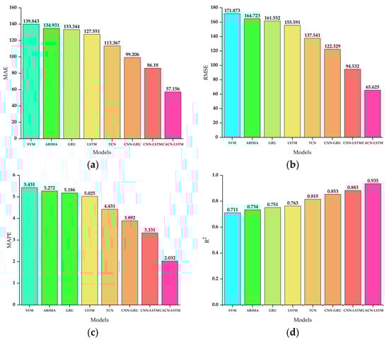 Figure 13 shows the different evaluation metrics for each model. The validation through various metrics demonstrates that the proposed model outperforms the others. The MAE value for CACN-LSTM is 57.156, the RMSE value is 65.625, the MAPE value is 2.032, and the R