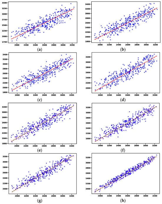 Figure 14 represent the actual power consumption, while the vertical coordinates denote the predicted power consumption. The blue dots represent the distribution of predicted values, and the red line represents the true value. The distance from the blue dots to the red line signifies the distance between the model’s predicted value and the actual value. The closer the blue dots are to the red line, the more accurate the prediction result.