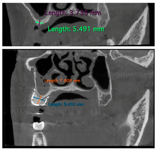 Table 1, where measurements in terms of height, B-O extension (buccal–oral), and M-D extension (mesio-distal) are presented, it can be observed that in all cases, there was a sufficient bone increase, enabling the final placement of 24 total implants in 10 sites treated with the GBR technique.