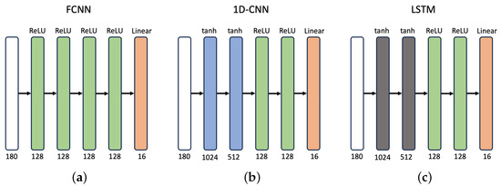 Proposed deep neural network architectures for prediction of the amplitude and phase of radiation patterns. (a) FCNN composed of four fully connected layers with 128 ReLU neurons and an output layer composed of 16 linear neurons. (b) 1D-CNN made up of two 1D-convolutional layers with 1024 and 512 hyperbolic tangent activation functions, two fully connected layers with 128 ReLU neurons, and an output layer of 16 linear neurons. (c) LSTM built using two LSTM layers with 1024 and 512 hyperbolic tangent activation functions, two fully connected layers with 128 ReLU neurons, and an output layer consisting of 16 linear neurons.