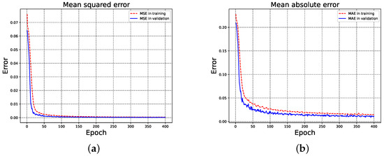 Performance of the LSTM during training and validation. (a) MSE during the training and validation process. (b) MAE during the training and validation process.