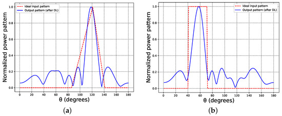 Hypothetical radiation patterns with high prediction difficulty were generated as input to the DNN with better performance (i.e., the previously trained and validated LSTM), resulting in amplitudes and phases for the antenna array. In Figure 5, the power pattern synthesis related to these idealized patterns (i.e., radiation patterns of arbitrary shapes not produced by antenna array) is shown. Figure 5a illustrates an optimal triangular input pattern, where the base of the triangle has an angular range from 85° to 140° and the opposite vertex to the base points at 120° with a gain of one. In the same manner, a perfectly square input pattern exhibiting a unit gain within the angular span of 40° to 70° is depicted in Figure 5b.