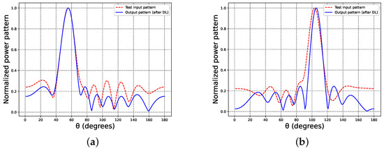 The solutions provided by the RNN for these ideal radiation patterns are shown in Table 2. As mentioned before, the output from the RNN served as input signals for the antenna array to generate a radiation pattern, as illustrated in Figure 1. In Figure 5, the radiation pattern is labeled as “Output pattern (after DL),” and the pulse of the input data is depicted as an “Ideal input pattern”. Due to the non-realistic nature of the input pattern, a complete match with the solution was not achievable. Nevertheless, the proposed RNN obtained an output value capable of generating a result similar to the desired beam pattern.