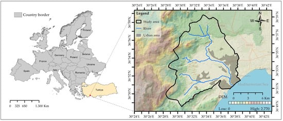 The Boğaçay sub-basin, which was determined as the study area, is located at the coordinates 36°52′1.02″ N and 30°37′4.65″ E within the borders of Konyaaltı/Antalya, one of the most important tourism destinations in Türkiye (Figure 1). The Boğaçay River in the study area, about 70 km long, originates in the Taurus Mountains and runs into the Mediterranean Sea west of Antalya city center. There is a variety of land cover and land use along its route, such as forest, agriculture, settlement, and natural vegetation, and it has a wealth of biodiversity in its surroundings [57]. According to the Köppen–Geiger climate classification, the study area is in the CSA group, with hot and dry summers and mild and rainy winters. The average annual temperature of the region is 17.4 °C and the average annual precipitation is 1215 mm [58].