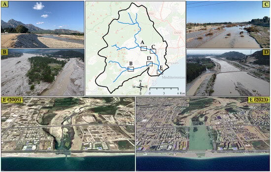 Key places in Boğaçay sub-basin. (A). The riverbed in Karaman brook and the agricultural and residential areas of the Aşağıkaraman neighborhood on its periphery. (B). The riverbed where the tributaries of the Çandır Brook converge and the agricultural and residential area in the Demircilik and Hacısekililer neighborhoods to the north of the river. (C). The riverbed of Karaman Brook near the city and the agricultural and residential areas of the Duraliler neighborhood. (D). Çandır Brook and the agricultural and residential areas in Demircilik and Hurma neighborhoods around the riverbed. (E). The region where the Boğaçay converges with the Mediterranean Sea and the surrounding settlements. Google Earth [61].