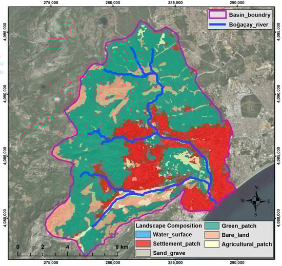 After obtaining the LULC digital map of the region from the https://livingatlas.arcgis.com/landcoverexplorer (accessed on 15 September 2024) website, subset operations were applied according to the sub-basin boundaries using ArcGIS Pro 3.2.0 Then, the stage of determining the landscape composition, which can be defined as the integrity formed by the combination of natural and artificial elements, was started. Landscape composition refers to the diversity of patch types within a landscape, usually measured using the proportions of different land cover types [71]. In determining the landscape composition, natural elements (water resources, vegetation, bare land, etc.) interact with cultural elements (agricultural areas, settlements, etc.) to create integrity [72]. Therefore, six classes of land cover types (water surface, settlement patch, green patch, agricultural patch, bare land, and sand/gravel) belonging to natural and artificial elements were identified for the study area, and landscape composition was defined (Figure 3).