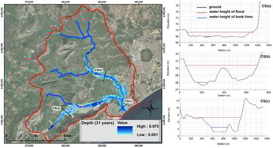 In the flood simulation with a flow rate of 1450 m3/s and a probability of recurrence in 31 years, the maximum depth is approximately 9 m. The land structure in the upper tributaries of the river is steep, and the deep valley formation indicates that flooding is unable to cause serious damage in these areas. However, the water flows out of the riverbed as it gets closer to the meeting point of the river with the sea, due to the partially flat terrain and shallow riverbed. According to the simulation, it is estimated that 1.4 m of water will rise in CS(a), 2.4 m in CS(b), and 2.8 m in CS(c).