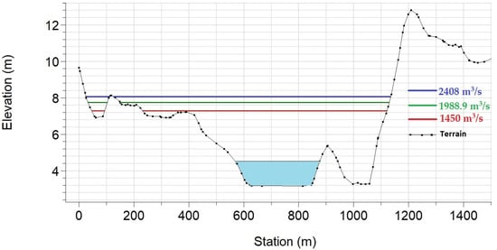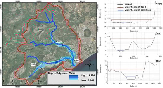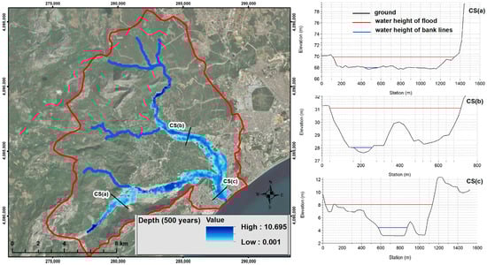 According to the flow rate calculated by MFWA [48], Q500: 2408 m3/s, the maximum depth in the flood simulation is approximately 10.7 m. It is predicted that the water will rise in CS(a) by 1.9 m, CS(b) by 3.1 m, and CS(c) by 3.6 m.