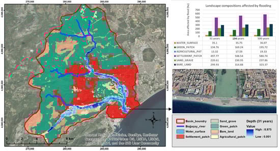 According to the 31-year flood scenario, 35.1 ha (51.7%) of the water surface, 134.76 ha (0.1%) of the green patch, 13.32 ha (0.4%) of the agricultural patch, 497.7 ha (12.2%) of the settlement, 220.61 ha (53.6%) of the sand/gravel, and 299.93 ha (10%) of the bare land are affected by flooding. For the 194-year flood scenario, 35.75 ha of the water surface, 169.24 ha of the green patch, 17.59 ha of the agricultural patch, 548.54 ha of settlement, 230.95 ha of the sand/gravel, and 314.88 ha of the bare land are affected by flooding. Based on the 500-year flood scenario, 36.07 ha of the water surface, 195.72 ha of the green patch, 19.33 ha of the agricultural patch, 580.74 ha of the settlement, 237.86 ha of the sand/gravel, and 323.37 ha of the bare land are affected by flooding.