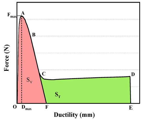 where S is the area of toughness (N·mm), D is the ductility (mm), and F is the force (N);