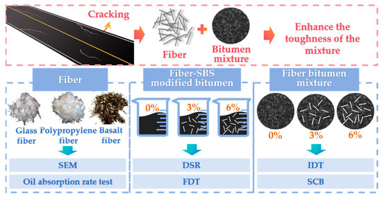 Physical modification focuses on improving the strength and modulus of the mixture by integrating nanoparticles or fiber materials, ultimately enhancing the crack resistance of bitumen pavements [20,21,22]. Nanoparticles can be effortlessly integrated with bitumen, due to their expansive specific surface area and exceptionally high surface energy [23]. Shafabakhsh et al. [24] investigated how ferric oxide (Fe2O3) nanoparticles influence the crack resistance of bitumen mixtures. Their findings indicate that the addition of just 1% of these nanoparticles considerably enhances the mixture’s fracture toughness. Zhang et al. [25] investigated how various sizes of nano-zinc oxide (ZnO) influence the low-temperature crack resistance of SBS bitumen mixtures. Their findings revealed that the effectiveness of nano-ZnO in enhancing crack resistance diminishes as the particle size increases. In essence, smaller particles yield higher surface energy, resulting in better performance in crack resistance at low temperatures. This characteristic significantly enhances the bonding quality at the interface between the aggregate and bitumen, while also boosting the mixture’s resistance to cracking. Jia et al. [26] investigated how bamboo fiber influences the mechanical characteristics of SBS bitumen binder and its mixtures. Their findings indicate that the inclusion of bamboo fiber enhances the flexibility of bitumen at low temperatures and bolsters the mixture’s resistance to cracking. Wei et al. [27] discovered that incorporating glass fiber into the epoxy bitumen mixture led to a notable 33.7% increase in both flexural and tensile strength. Ren et al. [28] revealed that using treated basalt fiber significantly boosts the bonding at the interface of the fiber and bitumen, thus enhancing the crack resistance of the fiber–bitumen blend. Therefore, fiber exhibits remarkable oil absorption capabilities and can be fully combined with bitumen, which greatly improves the mixture’s structural stability [29]. Additionally, fiber is cost effective and boasts exceptional flexibility. When incorporated into the mix, it not only provides a reinforcing effect but also enhances the mixture’s crack resistance and reduces the likelihood of crack propagation. Furthermore, fibers strategically placed at potential crack sites help diminish the formation of micro-cracks, thereby increasing the toughness of the mixture and extending the lifespan of the pavement [30,31]. The typical forms of fiber can be categorized as either bundled or flocculent, with bundled fibers being more commonly utilized due to their superior strength [32].