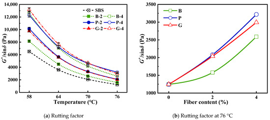 According to AASHTO T 315-20 [45], the fiber bitumen mortar was tested by the dynamic shear rheometer (DSR) test. Testing was conducted at a frequency of 10 rad/s ± 0.1 rad/s, with temperature scans performed at 58 °C, 64 °C, 70 °C, and 76 °C. According to the Superpave specification, the rutting factor G*/sinδ is used to characterize the high-temperature performance of bitumen binder. The impact of various fiber types and their quantities on the high-temperature rheological properties of the bitumen mortar were investigated.