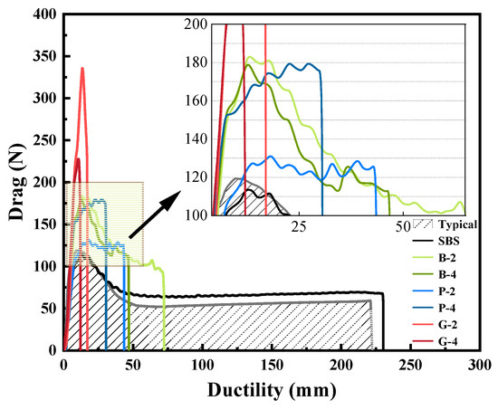 Incorporating fiber enhances the viscosity of SBS bitumen but may negatively impact its tensile characteristics at low temperatures. The pre-peak gradient of the force–ductility curve serves as an indicator of the bitumen’s viscosity. Compared with the typical curve, the pre-peak slope of the measured curve of the composite-modified bitumen increases, the curve fluctuates significantly after the peak, the tension decreases rapidly, and the creep stage disappears. The findings indicate that adding fiber enhances the viscosity of bitumen, while its brittleness increases in colder temperatures. As a result, the maximum tensile force of fiber-reinforced bitumen sees an increase, although its ductility diminishes. Throughout the testing, internal damage develops within the bitumen. Certain fibers at the fracture surface of the specimen experience a sequence of ’curved-straight-broken,’ while others are pulled out from the bitumen itself [59]. This intricate interaction results in noticeable fluctuations within the curve. After the peak tension, the polymer inside the bitumen cannot be changed from disordered to ordered, and the sample is destroyed, resulting in the disappearance of the SBS bitumen strength ‘not falling but rising’ stage, and the curve shows a cliff-like decline.
