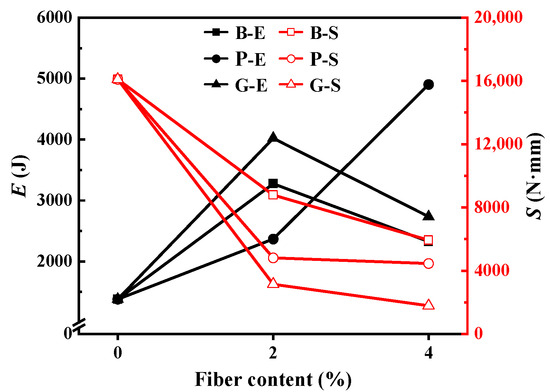 The inclusion of fiber enhances the mechanical characteristics of SBS bitumen at low temperatures while also diminishing its elasticity. Specifically, this results in a notable increase in the E of SBS bitumen, alongside a gradual reduction in its S. When the fiber content was 2%, the E of B-2, P-2, and G-2 increased by 138%, 72%, and 192% respectively, while the S decreased by 45%, 70%, and 80% respectively. The above phenomena indicate that bitumen needs to do more work in the yield stage, but its overall tensile work decreases significantly with the decrease in ductility. The reason is that after adding fibers, the unbroken fibers in the tensile process can connect the broken ends of the specimen, and the structural bitumen increases, so the fracture of the specimen needs to be stronger [60]. As the fiber concentration rose to 4%, the enhancements in E for B-4, P-4, and G-4 were striking, climbing by 69%, 256%, and 98%, respectively, when juxtaposed with SBS bitumen. Notably, only polypropylene fiber played a continuous role in the improvement. The S of B-4, P-4, and G-4 decreased by 63%, 72%, and 89%, respectively, compared with SBS bitumen. Compared with S at 2% content, the decrease for P-4 was the smallest, only 7%. The fiber dispersion is not good, and the agglomeration is easily destroyed. Under low dosage, agglomeration appears less, and its disadvantage is not significant. With the increase in fiber content, agglomeration hinders the formation of network structure, and the disadvantages become more prominent. It shows an increase in brittleness in the test. And the reduction in free bitumen will increase the viscosity. Under the two effects, the breaking process is greatly shortened, and the tensile force in a short time is significantly improved. The dispersion of basalt fiber and glass fiber is poor, and the content increases, and the agglomeration has a significant effect on it. This causes E to decrease. As the fiber content rises from 2% to 4%, polypropylene fibers exhibit better integration with the bitumen due to their greater oil absorption capability, resulting in the lowest rate of change in S for SBS bitumen.