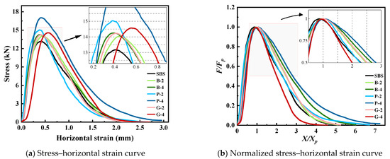 Upon examining the stress–horizontal strain curve, it is evident that the horizontal strain that aligns with the maximum stress of various specimens typically hovers around 0.5 mm. In order to carry out quantitative analysis and unified evaluation, a unified standard was adopted when calculating the toughness index of the mixture. After the stress reaches the peak value, when the stress decreases to 50% of the peak value, the corresponding normalized horizontal deformation is XX/Xp, and the area under the normalized curve is AX/Xp. The toughness of the mixture was assessed by calculating the proportion of the area beneath the 50% normalized curve, following the peak, to the normalized horizontal strain of the section.