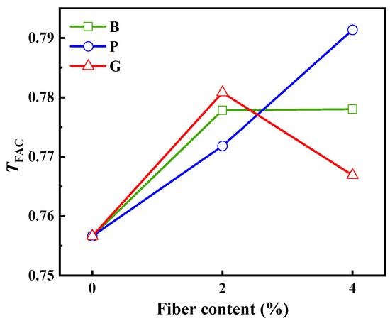 The addition of fiber notably enhances the TFAC of the bitumen mixture. When a 2% dosage is applied, the TFAC of B-2, P-2, and G-2 increased by 2.8%, 2%, and 3.19%, respectively, and the differences among the three were small. When the content increased to 4%, the TFAC of B-4, P-4, and G-4 increased by 2.82%, 4.59%, and 1.36%, respectively. The definition of TFAC is closely related to the post-peak behavior of the indirect tensile test curve. As illustrated in Figure 8b, the slope of P-4 post-peak curve is the smallest, which signifies that incorporating polypropylene fiber at a 4% concentration leads to the most substantial enhancement in the toughness of the bitumen mixture. The slope of G-4 is the smallest. Incorporating 4% glass fiber into the bitumen mixture enhances its initial crack resistance; it falls short in sustaining resistance against persistent cracking, leading to lackluster overall toughness. Fibers enhance the mixture’s resistance to cracking through mechanisms such as lapping, reinforcement, and load transfer. However, fiber agglomeration and uneven dispersion weaken its positive role in the mixture, thereby reducing crack resistance and toughness. The various types and amounts of fiber play an important role in influencing how bitumen mixtures perform during different stages of cracking. Basalt fiber and glass fiber can effectively resist the propagation of small cracks in the early stage of crack resistance due to their high monofilament tensile strength. Polypropylene fiber, with its excellent flexibility and elasticity, is more conducive to delaying the further expansion of cracks, showing the potential to improve toughness in bitumen mixtures [62].