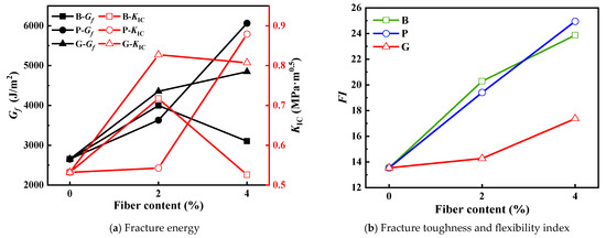 The FI of the bitumen mixtures rises as the fiber content increases. At 2% dosage, the FI values for B-2, P-2, and G-2 showed rises of 49.86%, 43.39%, and 5.44%, respectively. Both basalt and polypropylene fibers exhibited substantial benefits. At 4% dosage, the FI for B-4, P-4, and G-4 experienced increases of 76.34%, 84.32%, and 28.32%, respectively, with polypropylene fiber demonstrating the most significant improvement. It is worth noting that the changing trend for FI is not always synchronized with Gf and KIC. FI is not only based on Gf, but also integrates the peak change rate of the stress–strain curve after fracture. This index serves as a thorough representation of the material’s toughness and its ability to absorb energy. It offers a fresh lens through which to assess the fiber modifications in bitumen mixtures, enabling a more holistic evaluation of how fibers impact the performance of these mixtures.