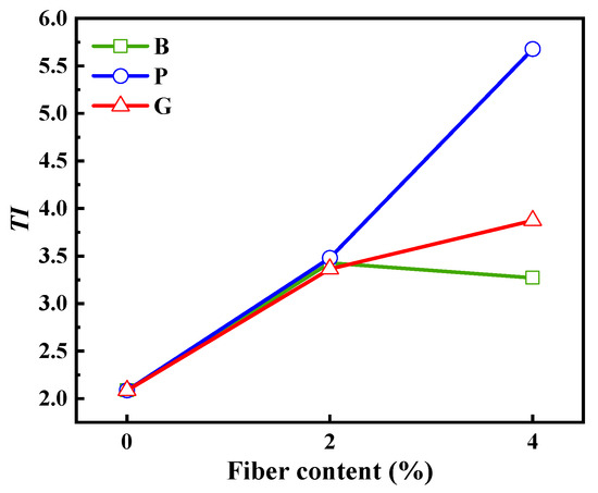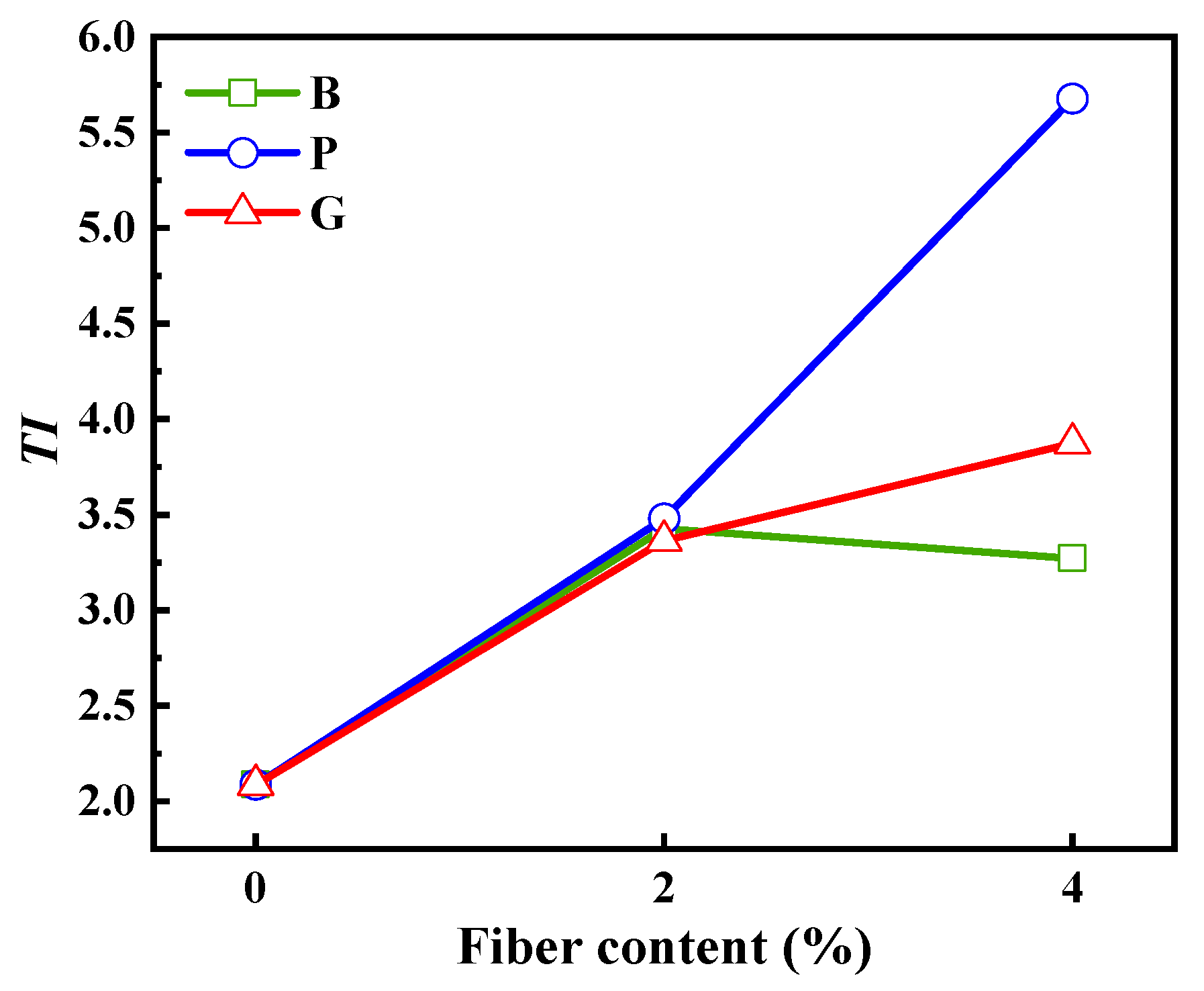 The inclusion of fiber markedly enhances the TI of the bitumen blend, while also improving the material’s resistance to cracking and overall durability. At the dosage of 2%, the TI of the three fiber mixtures was improved compared with that before incorporation, and the difference was small, but the polypropylene fiber still showed the best improvement effect. At the dosage of 4%, the TI for both P-4 and G-4 saw increases of 63% and 15%, respectively. Conversely, the TI for B-4 dipped by 5%, yet it remained above the baseline value of the undoped fiber. Polypropylene fiber significantly enhances the overall toughness of the mixture. Incorporating fiber into the bitumen blend can certainly boost its resistance to cracking and improve its toughness. Nonetheless, it is essential to consider the appropriate fiber dosage with great care. For fibers with high tensile strength but weak bonding ability with bitumen, excessive content may lead to curling and agglomeration of fibers in the mixture. This diminishes the strengthening benefits of fiber, potentially impacting the bond between bitumen and aggregate, and ultimately compromising the overall structural integrity of the mixture. On the contrary, for fibers with relatively low tensile strength but strong binding capacity with bitumen and good dispersion, it may be more appropriate to increase their content [65]. Under the condition of the same amount of bitumen, this kind of fiber can be combined with more bitumen, showing a more significant effect. Thus, the variety and composition of fiber, along with its relationship with bitumen, are important elements for enhancing the performance of the bitumen blend. A thorough consideration of these aspects is essential to attain optimal modification results.