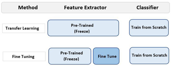 TL is a learning method that reuses the knowledge from a previously trained model to solve a new problem. This approach speeds up model training and improves performance. In DL models, leveraging the features of a model that has been trained extensively on large datasets can reduce the quantity of data required for a new task and enhance generalization performance. TL enables the model to quickly adapt to complex tasks by utilizing previously learned features, while also reducing computational costs by shortening the training time. A schematic representation of TL through fine-tuning is shown in Figure 3.