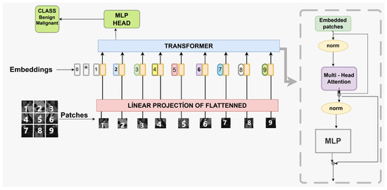 Transformers are deep neural networks initially used in the field of natural language processing. Due to their powerful capabilities, transformer-based models have often performed similarly to or better than other types of networks, such as CNNs and RNNs, in visual benchmarking studies [33]. The ViT divides each image into small patches. These patches are flattened according to their positional order and each patch is represented at a certain size. Positional encoding is used in ViT to preserve the order of the patches, allowing for the model to learn the relationship of each patch with others. ViT models use the self-Attention mechanism (SAM) to understand the context between distant pixels in the image. This enables the model to evaluate the relationship between any two points in the image. Structurally, the inter-layer SAM allows for each patch to establish relationships with all other patches, supporting more global feature learning. The structure of the ViT architecture used in this study is shown in Figure 4.