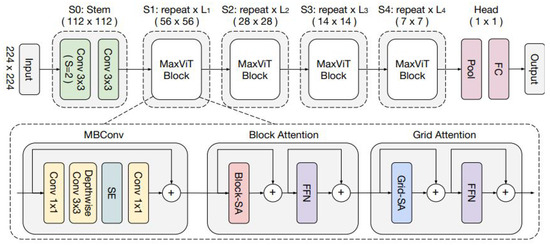 MaxViT, a multi-axis vision transformer, is a hybrid model that combines CNN and ViT architectures [34]. MaxViT uses a multi-axis attention mechanism to learn local and global features simultaneously. In this way, it achieves high performance by effectively capturing both local details and global context in image processing tasks. MaxViT’s block architecture combines a set of attention and convolution mechanisms designed to capture local and global features effectively. While depth convolutions and block attention extract local features, grid attention and channel attention learn global context and feature importance. The multi-axis attention mechanism allows for the model to learn relationships across dimensions simultaneously. Hopping and normalization techniques improve the training process and increase the depth of the model while preserving its performance. This hybrid approach gives MaxViT high accuracy and efficiency in computer vision tasks. Its architectural structure is shown in Figure 5.