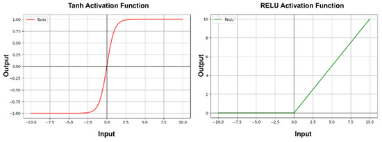 As indicated in the graph in Figure 7, Tanh compresses the outputs between −1 and 1, ensuring that the neurons have a zero-centered distribution, which contributes to more balanced weight updates. ReLU may cause some neurons to be completely disabled because it sets negative values to zero, potentially limiting the model’s learning capacity and causing the ‘Dead Neuron’ problem. The sensitivity provided by the Tanh function, particularly in learning complex features, increased the model’s accuracy and led to a more stable convergence process.