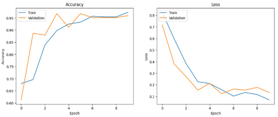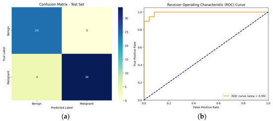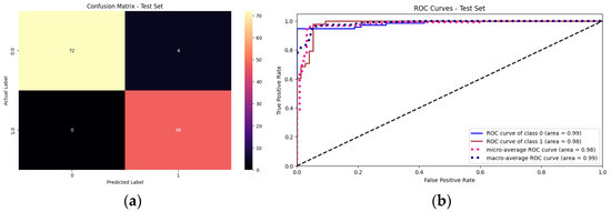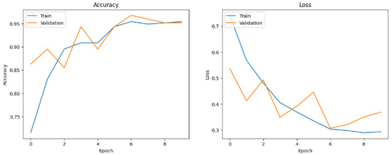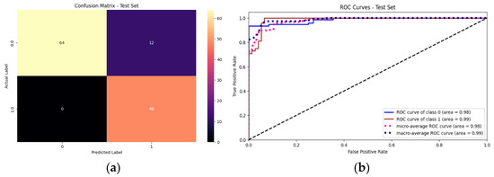 In our FT-EPN model, a pyramid architecture was used to learn complex features more effectively, and an increase in accuracy was achieved by adding convolutional layers before each MaxPooling layer. The L2 regularization technique was chosen to prevent overfitting, and the most appropriate regularization coefficient was determined to be 0.0001. It was observed that L2 regularization provided better results than dropout. The training process was optimized by using the Adam optimization algorithm with a learning rate of 0.0001, and training was terminated when no progress was made in the model, using the early stopping method. The Tanh activation function contributed to a more balanced learning process by providing a zero-centered distribution. The accuracy and loss curves of the FT-EPN model are shown in Figure 10, and the confusion matrix and ROC curve are presented in Figure 11. The performance results are summarized in Table 3.