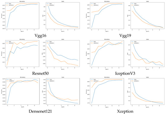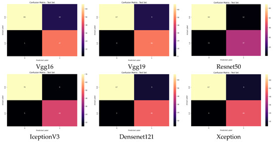 The accuracy and overall performance of the model were evaluated using the pre-trained CNN architectures Vgg16, Vgg19, Resnet50, InceptionV3, Densenet121, and Xception, as mentioned in the Section 3.3 of this paper. Only the feature extraction layers of these models, pre-trained with the ImageNet dataset, were used, and the classification layers were re-trained. The accuracy and loss curves obtained with the TL strategy for each pre-trained model are shown in Figure 12, and the confusion matrices are shown in Figure 13. The performance results, calculated using the metrics for a comprehensive comparison of the classification success of the models, are given in Table 4.