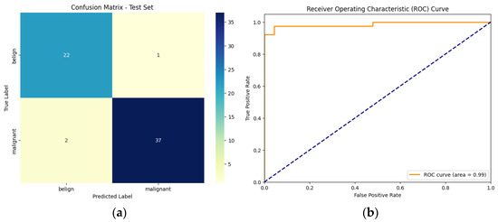 The performance results of the proposed FT-EPN model are finally compared with the classification performances of the popular ViT and MaxViT-v2 hybrid models. Unlike traditional CNN-based approaches, the ViT model uses SAM to divide the image into small patches and model the relationship of each patch with the others. This approach allows for capturing global contexts in the image, providing more global feature learning. MaxViT combines the strengths of both CNN and ViT architectures, enabling it to learn local and global features simultaneously. The model successfully captures both local information and the image’s global context due to the multi-axis attention mechanism. The confusion matrix and the ROC curve of the ViT architecture are shown in Figure 14. The confusion matrix and the ROC curve of the MaxViT-v2 architecture are shown in Figure 15. The performance results of the ViT and MaxViT-v2 transformer models are presented in Table 5.