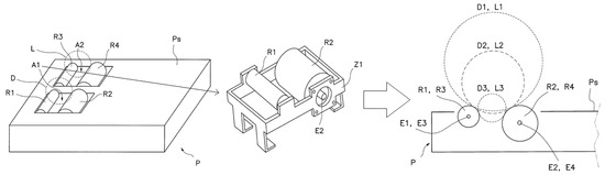 The platform features two primary components, the rear and front cylinders, that are critical for the interaction between the wheelchair and the platform, which can be seen in Figure 2, where P refers to the complete platform, R1–R2 and R3–R4 are the cylinders, E1–E3 and E2–E4 are the roller shafts, Z1–Z2 are the support bases for Ex, and Dx refers to the different wheel diameters and Lx to the longitudinal separation between wheels.
