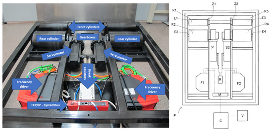 The hardware system described provides a comprehensive solution for integrating wheelchair users into immersive VR environments, offering a realistic and engaging experience through sophisticated haptic feedback mechanisms. All hardware parts can be observed in Figure 3, where, in addition to the abbreviations already described in Figure 2, S1–S2 are the servomotors, F1–F2 are the frequency drivers, R is the braking resistances, M the TCP/IP-System bus module, C the computer and V the visualization system.