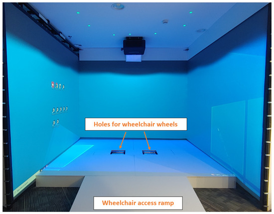 The developed haptic system for wheelchair users consists of a robust and sophisticated hardware setup, which can be seen in Figure 1, designed to seamlessly integrate with virtual reality environments, particularly CAVE (Cave Automatic Virtual Environment) systems, which are room-sized virtual reality spaces that project images onto walls, floor, and ceiling to create an immersive experience. The primary objective of this system is to allow wheelchair users to navigate virtual environments using their wheelchairs while providing realistic haptic feedback to enhance the sense of presence and immersion. As users maneuver the wheelchair, the system captures their movements and translates them into the virtual environment (projected in the CAVE) in real time. The system consists of a platform with 4 openings in the floor, corresponding to the places where the wheels of the user’s wheelchair should be positioned. In these openings, the two front ones are free rollers, while the two rear ones are rollers where one of each pair is connected to a servomotor. This only happens on the rear wheels because they are usually the driving wheels with which the user interacts (the ones that accelerate or brake).