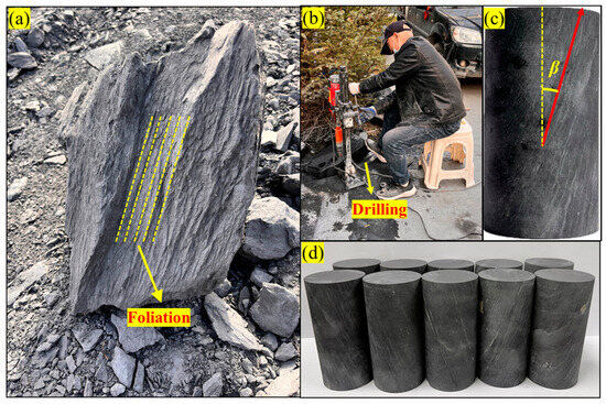 Carbonaceous slate samples were collected from a tunnel construction site located in western China. As shown in Figure 1a, the rock blocks exhibit prominent foliation. The wireline coring method (Figure 1b) was used to obtain core samples with five different angles, β, which represents the angle between the foliation planes and the loading direction (Figure 1c). The angles considered for investigation were β = 0°, 15°, 45°, 75°, and 90°. The core samples were prepared according to ISRM (International Society for Rock Mechanics and Rock Engineering) requirements, with a diameter of 50 mm and a length of 100 mm. The measurement error was controlled within ±0.5 mm, and the surface parallelism was maintained at ±0.02 mm (Figure 1d).