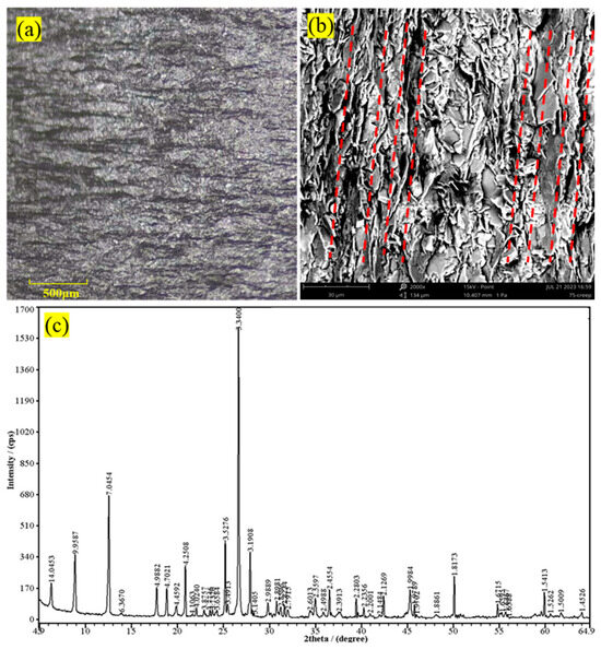 Figure 2. Microscopic examination of rock samples. (a) Optical microscope image of carbonaceous slate [26]; (b) scanning electron microscope image of foliation surface; (c) XRD results.