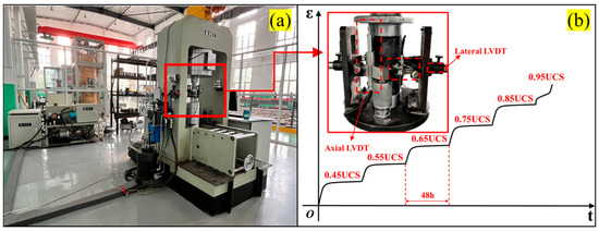 • The creep test was performed by utilizing preset axial loading ratios of 0.45, 0.55, 0.65, 0.75, 0.85, and 0.95 (Figure 3b). The load level gradually increased at a rate of 0.10 kN/s until it reached the preset value and then it was maintained at that level for 48 h. The axial deformation was monitored using two axial linear variable differential transformers (LVDTs), while the lateral deformation was recorded using two circumferential LVDTs.