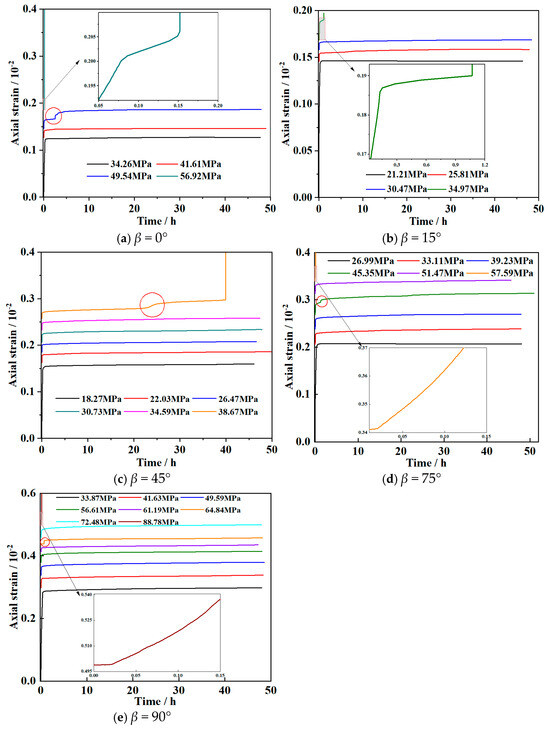Figure 4. The strain–time curve under multi-level stress for carbonaceous slate with different foliation angles.