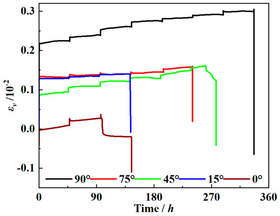 Figure 6. Volumetric strain–time curves of carbonaceous slate under multilevel stress with different foliation angles.
