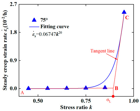 The tangent method of steady creep rate [30] was utilized to calculate the σL of carbonaceous slate. Taking β = 75° as an example, a fitted curve was generated to represent the relationship between steady-state creep rate and loading ratio, as illustrated in Figure 7. Furthermore, two lines tangent to the curve (AB and BC in Figure 7) were created, and the stress corresponding to the intersection point (point B) was defined as σL.