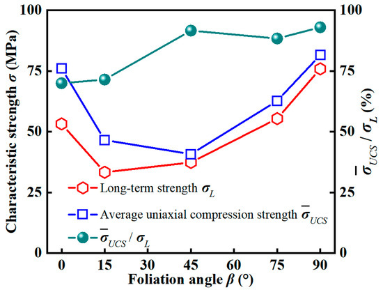 2. The long-term strength, σL, of carbonaceous slate showed a U-shaped pattern with the variation in β. The maximum of σL occurred at β = 90°, and the minimum was observed at β = 15°.
