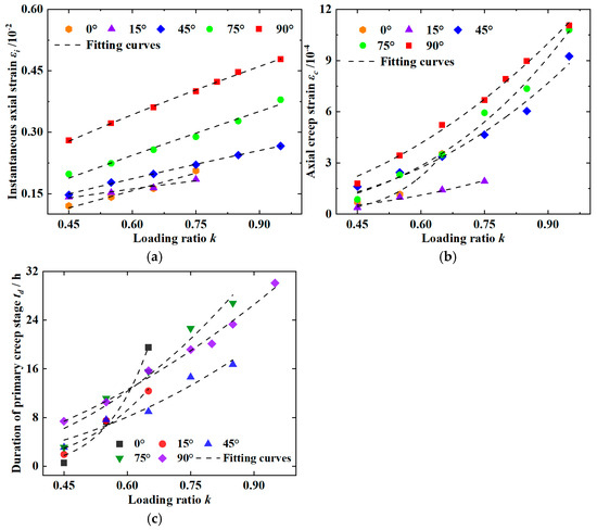 where a and b are constants, y represents any given creep parameter, and k = σa/ σ ¯ U C S denotes the loading ratio, σa is the predefined loading stress, and σ ¯ U C S is average uniaxial strength. The curve fitting parameters are listed in Table 2, with all R2 (Coefficient of Determination) exceeding 0.95.