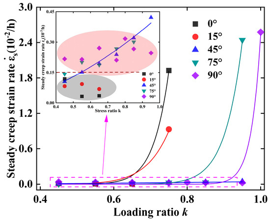 The relationship between steady creep strain rate, ε ˙ s , and loading ratio, k = σa/ σ ¯ U C S , is illustrated in Figure 10. With an increase in k, the creep rate laws exhibited significant anisotropy. Specifically, ε ˙ s showed a considerable rise when β < 45° and k = 0.75. Similarly, when β > 45° and k 0.95 , ε ˙ s increased. The phenomena can be attributed to several factors. Firstly, the slate experienced a short period of steady creep, during which internal fissures stabilized and propagated. Subsequently, the slate quickly transitioned into the failure stage. When β = 45°, ε ˙ s was at the same order of magnitude. In addition, the ε ˙ s values obtained for β < 45° (gray ellipse) were found to be less than 1.5 × 10−4/h. When β 45 ° , the steady creep rate was greater than 1.5 × 10−4/h (red ellipse).