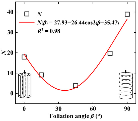 Figure 11 presents a scatter plot showing the correlation between the unknown parameter N and the foliation angle β, wherein the curve exhibits a “U-shaped” pattern. The data were fitted using the strength formula proposed by Donath [32]. The R2 reached 0.98, justifying the high correlation. The relationship between β and the unknown parameter N is expressed as: