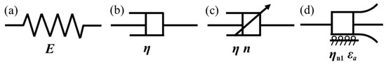 Figure 12. The basic mechanical components: (a) Hooke spring; (b) Newton dashpot; (c) fractional Abel dashpot; (d) nonlinear viscous dashpot.