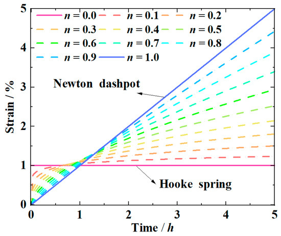 As shown in Equation (13), the stress of the Hooke spring and the Newton dashpot is proportional to the zero-order and one-order derivative of the strain, respectively. Considering that creep starts at time t = 0 under a constant stress, let a = 0 and f(t) = σ(t) = σ in Equation (9). ε(t) can then be expressed as: