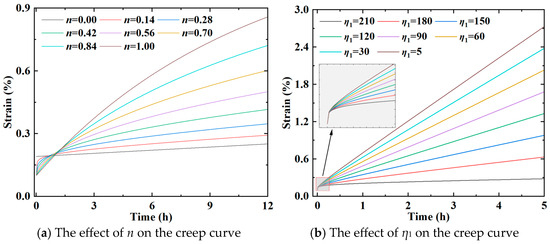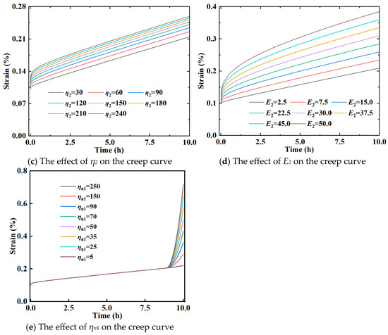 When σ < σs, with σ = 20 MPa, setting σ/E1 = 0.1 represents the instantaneous strain, σ/η1 = 1.0, σ/E2 = 1.0, and E2/η2 = 0.1, and the resulting creep curves for varying fractional orders n are shown in Figure 15a. With other parameters unchanged and the fractional order fixed at n = 0.2, changing η1 and η2 yields the creep curves shown in Figure 15b,c, respectively. In addition, the creep curves with the increasing E2 are depicted in Figure 15d.