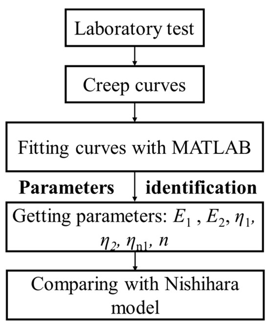 In MATLAB, establish the constitutive equation described in this text and set the initial values for the model parameters. Create a function to calculate the difference between predicted values and creep data obtained from carbonaceous slate with various foliation angles. Utilize MATLAB’s optimization tools to adjust the parameters in order to minimize this difference. The flow chart of parameters identification method is illustrated in Figure 16. The final parameter fitting results are presented in Table 3.