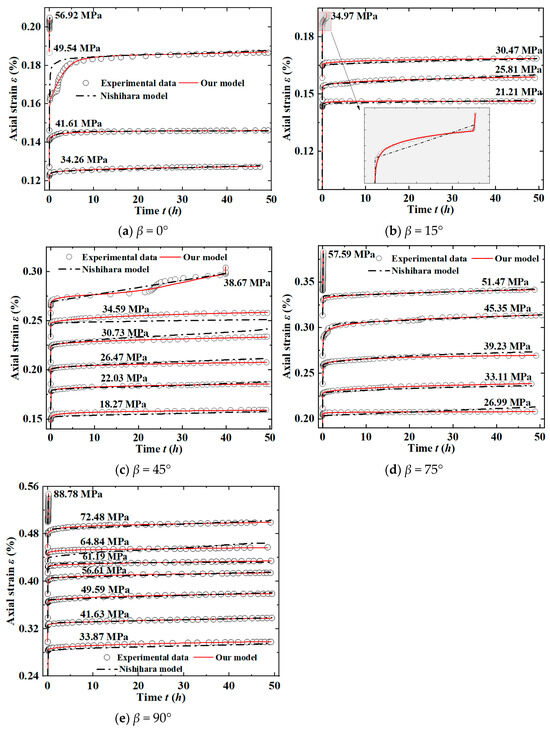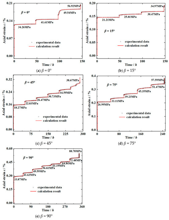 When β < 45°, carbonaceous slate is prone to shear slip along the foliation plane under high stress levels. Therefore, the Nishihara model can only describe the creep process under low stress. When β > 45°, however, the foliation planes are compacted due to the high stress and is not prone to slip. Hence, the Nishihara model can better describe the creep process under high stress. When β = 45°, shear slip along the foliation is more likely to occur during the creep, and the Nishihara model can hardly accurately describe the creep process [26].